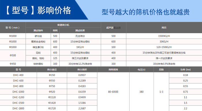 超聲波篩分機(jī)型號有:DHC-400、DHC-600、DHC-800、DHC-1000、DHC-1200、DHC-1500、DHC-1800、DHC-2000等八種標(biāo)準(zhǔn)直徑型號;不同型號的超聲波篩分機(jī)的價格就是不同,其中影響型號的的因素有:篩網(wǎng)(1—5層)、材質(zhì)(不銹鋼、碳鋼)、振動電機(jī)(功率不同)等。